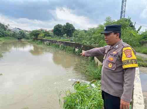 Antisipasi Banjir, Bhabinkamtibmas Polsek Pasar Kemis Pantau Debit Air Kali Cirarab
