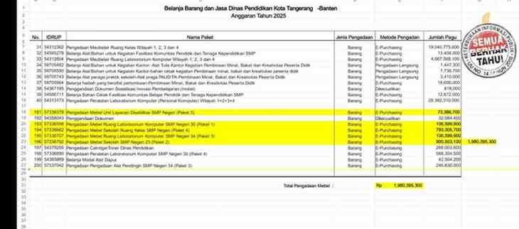Alapalapnews.com – Kota Tangerang – Dugaan penyimpangan dalam pengadaan mebel sekolah di lingkungan Dinas Pendidikan Kota Tangerang kembali mencuat. Sejumlah proyek dengan nilai ratusan juta hingga miliaran rupiah diduga tidak terealisasi sesuai pagu anggaran tahun 2025. Temuan tim Metropolitanin8.com menyebutkan, pengadaan mebel ruang laboratorium komputer di SMPN 30 senilai Rp106.599.900 belum terealisasi. Sementara di SMPN