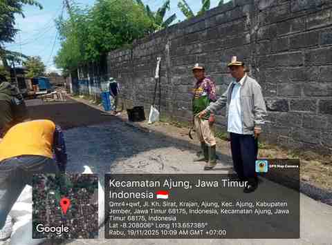 Alapalapnews.com – Kab. Jember – Kegiatan perbaikan jalan aspal di Dusun Krajan, Desa Ajung, Kecamatan Ajung, Kabupaten Jember, menjadi salah satu upaya nyata Pemerintah Kabupaten Jember melalui Dinas Pekerjaan Umum (PU) dalam meningkatkan kualitas infrastruktur jalan di wilayah pedesaan, Rabu (19/11/25). Program ini merupakan tindak lanjut dari laporan masyarakat melalui kanal Wadul Guse yang memungkinkan