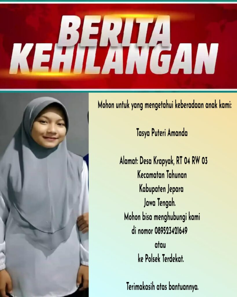 Mohon bagi siapapun yang menemukan atau mengetahui keberadaan anak gadis tersebut bisa menghubungi pihak keluarga di nomor 089523421649 atau menghubungi Polsek Terdekat.