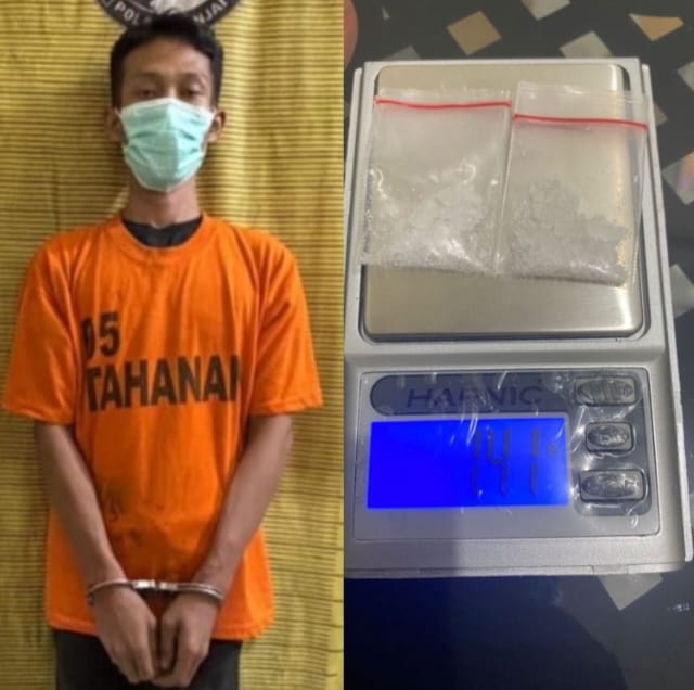 Berkat kesigapan petugas, pria tersebut akhirnya berhasil diamankan. Dari hasil penggeledahan, polisi menemukan dua paket diduga sabu seberat brutto 1,41 gram yang dibungkus plastik klip transparan, serta satu unit ponsel Android merek Infinix warna biru.