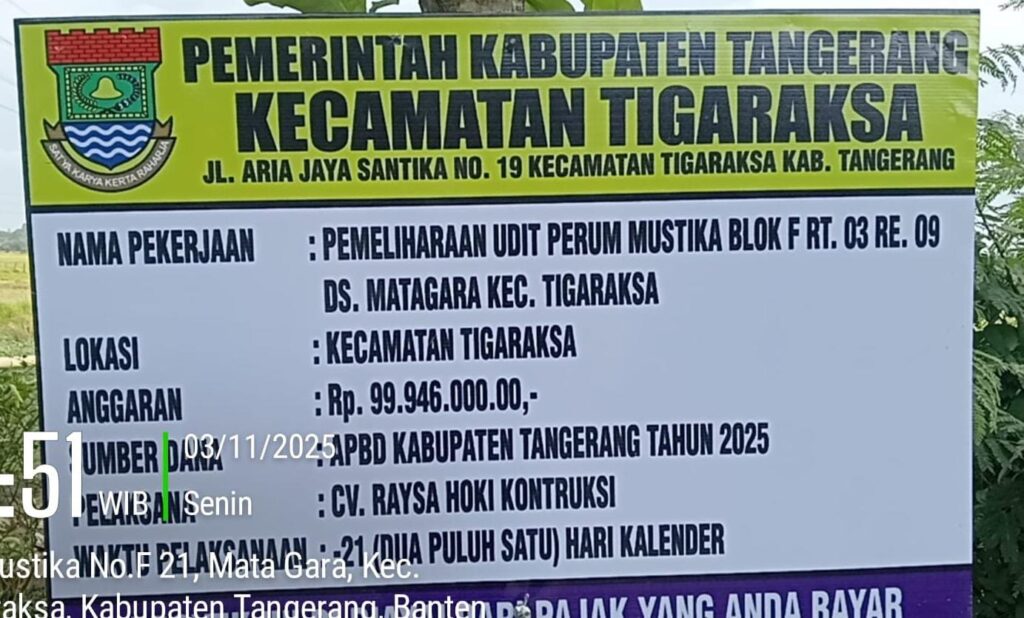 Melalui Dinas Perumahan Rakyat Dan permukiman ( Perkim ) Kabupaten Tangerang, direalisasikan pembangunan saluran air Uditch, beralamat di prumahan .mustika blok F RT.03 RW. 09 Desa matagara Ke camatan Tigaraksa dengan anggaran yang bersumber dari APBD 2025, berjumlah Rp. 99.946 000, dengan CV. Raysa Hoki kontruksi pembangunan Uditch.