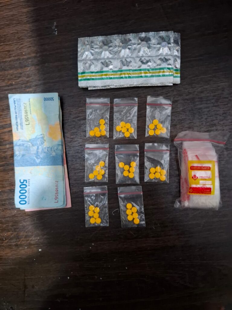 Dari hasil pemeriksaan dan penggeledahan di tempat kejadian, petugas menemukan sejumlah obat-obatan keras yang diduga diperjualbelikan tanpa izin, di antaranya Tramadol sebanyak 50 butir dan Heximer sebanyak 48 butir, serta uang tunai hasil penjualan sebesar Rp250.000. Selain itu, turut diamankan 1 (satu) buah KTP dan 1 (satu) unit handphone merk VIVO warna biru.
