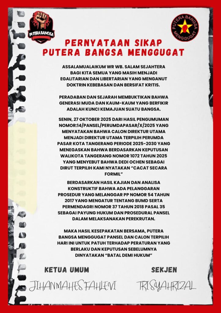Organisasi tersebut menyoroti pengumuman hasil seleksi bernomor 14/PANSEL/PERUMDAPASAR/X/2025. Disebutkan bahwa calon terpilih, Dedi Ochen, dinyatakan sebagai Direktur Utama Perumda Pasar Kota Tangerang.