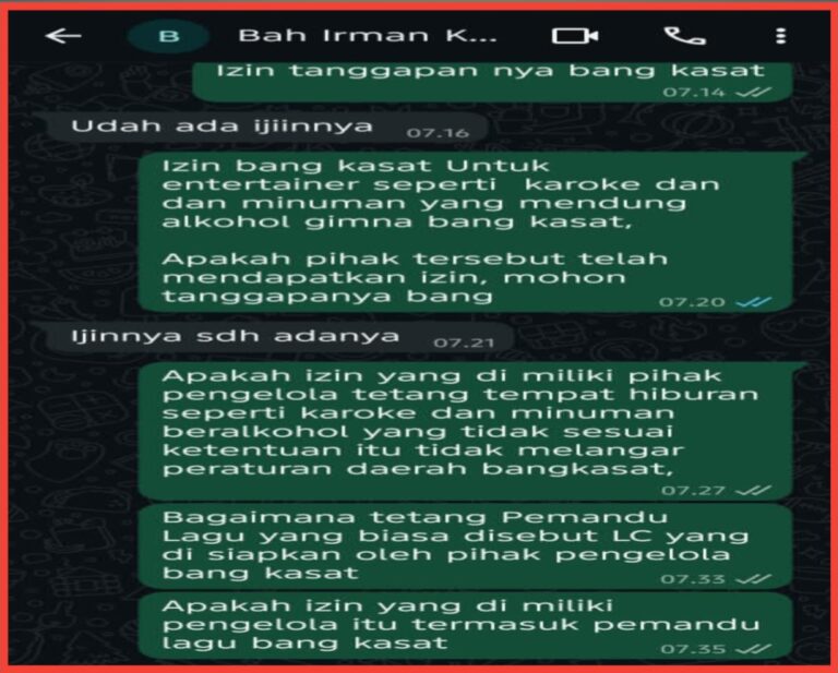 Jawaban R.Irman “Udah ada ijinnya, lanjut tim media” izin bang kasat untuk intertainer seperti karaoke dan minuman yang mengandung alkohol gimana bang kasat, apakah pihak tersebut telah mendapatkan izin, mohon tanggapannya bang, jawab singkat kasatpol pp” ijinnya sudah adanya” kata Kastpol